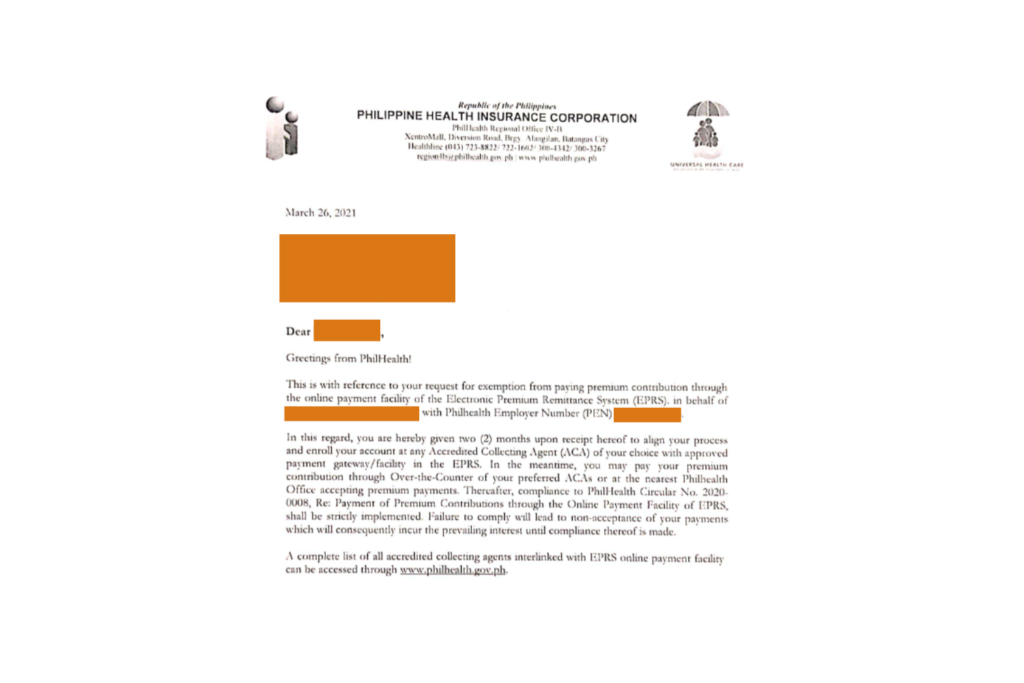 A Certificate of Exemption will be given to employers granting them a two-month grace period to comply with the bank enrollment. Over-the-counter payments at the Philhealth branches will be accepted within the grace period.