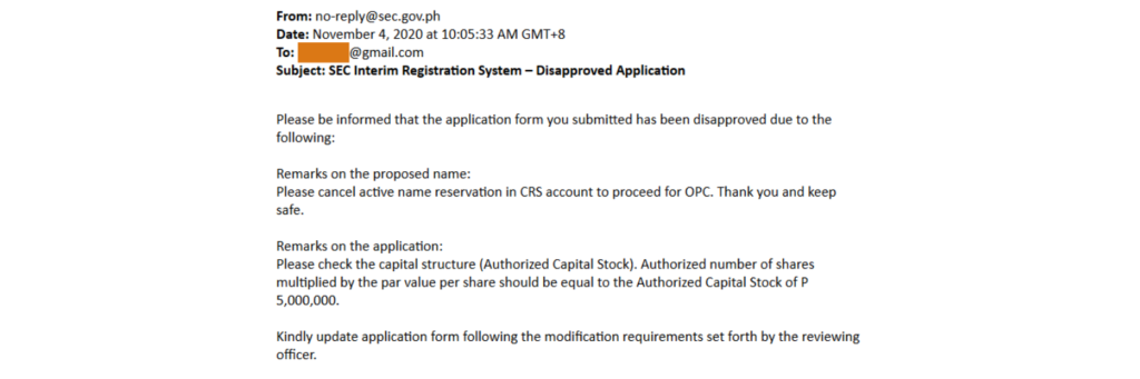 Be mindful of the exact type of corporation you’d like to register — whether that’s a regular domestic corporation or a one-person corporation. The SEC will reject duplicate applications under the same business name even if one is a regular domestic corporation and the other is a one-person corporation.