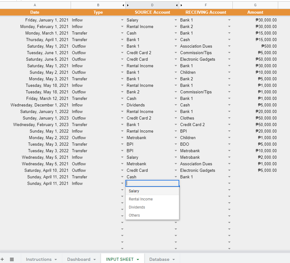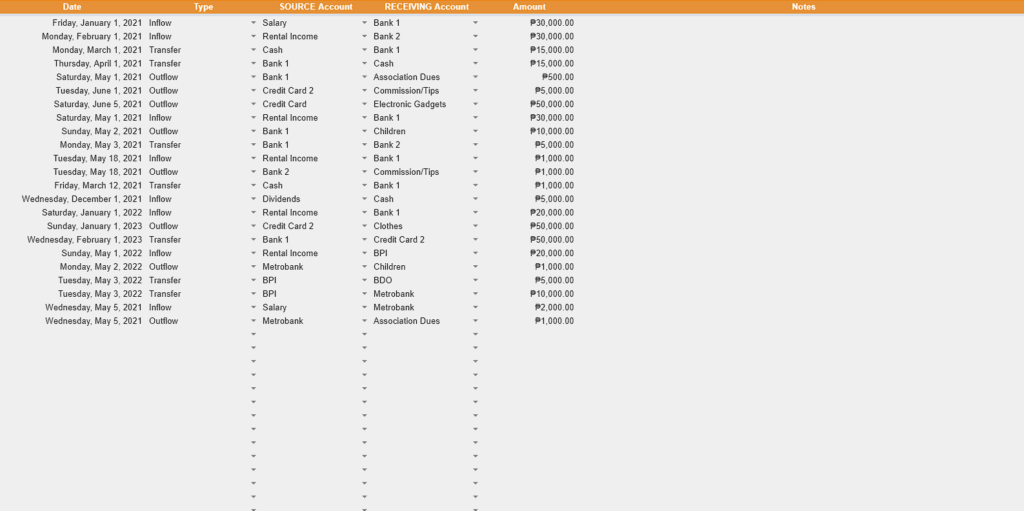 If recording transactions seem confusing, we’ve created a Google Sheets Budget Tracker that automates the selections per column (i.e., Source Account and Receiving Account), thereby avoiding mistakes.